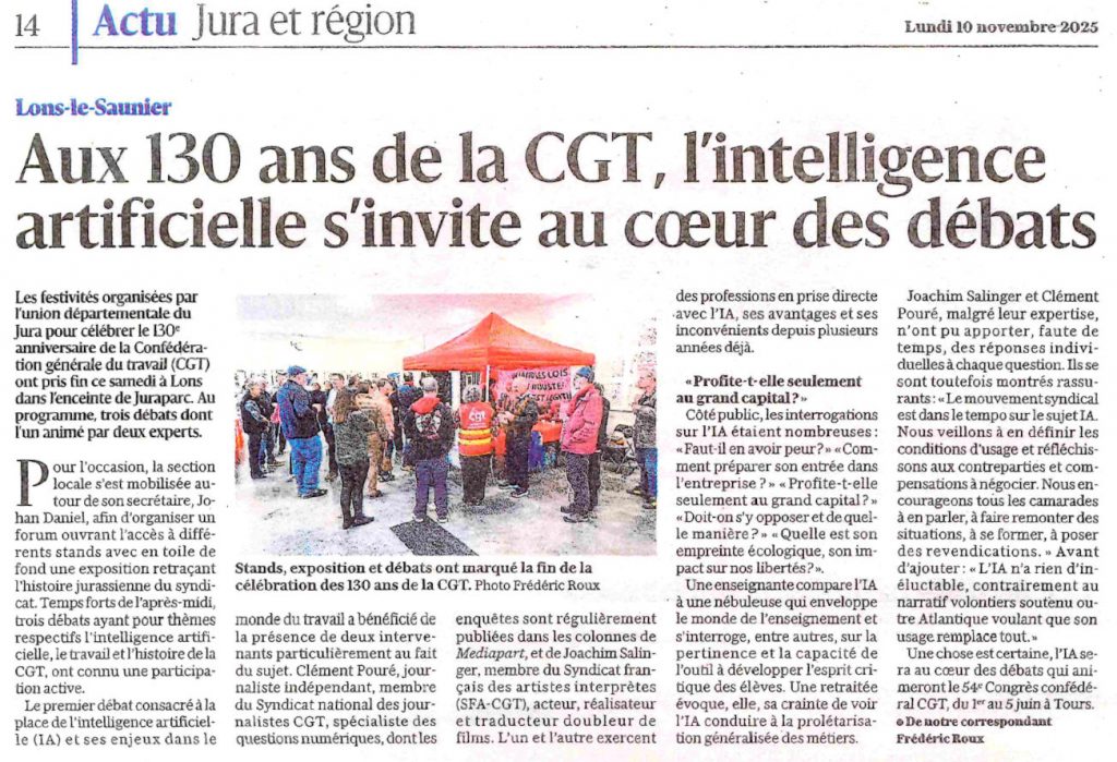 Voir le tract →Article du Progrès : Aux 130 ans de la CGT, l’intelligence artificielle s’invite au coeur des débatsLa CGT, avec la FSU et Solidaires, appelle les salarié·es, les jeunes et les retraité·es à se mobiliser le 2 décembre prochain pour enterrer tous les reculs sociaux qui figurent toujours dans le projet de budget et réaffirmer leur exigence d’abrogation de la réforme des retraites ! Voir le communiqué →Communiquée de presse : Rien n’est encore joué, car le débat budgétaire durera jusqu’à mi-décembre. C’est le moment d’amplifier nos mobilisations de la rentrée pour mettre la pression pour obtenir la justice sociale, fiscale et environnementale dans ce budget. Nous voulons enterrer définitivement toutes ces régressions, gagner l’abrogation de la réforme des retraites, et obtenir les moyens nécessaires pour nos services publics ! Voir le communiqué →Voir aussi…