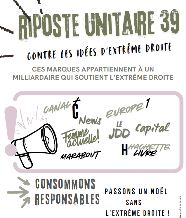 - Riposte unitaire 39 : contre les idées d’extrême droiteRiposte unitaire 39, contre les idées d’extrême droite. Bolloré, Stérin : Passons un Noël sans l’extrême droite ! Voir les tracts →