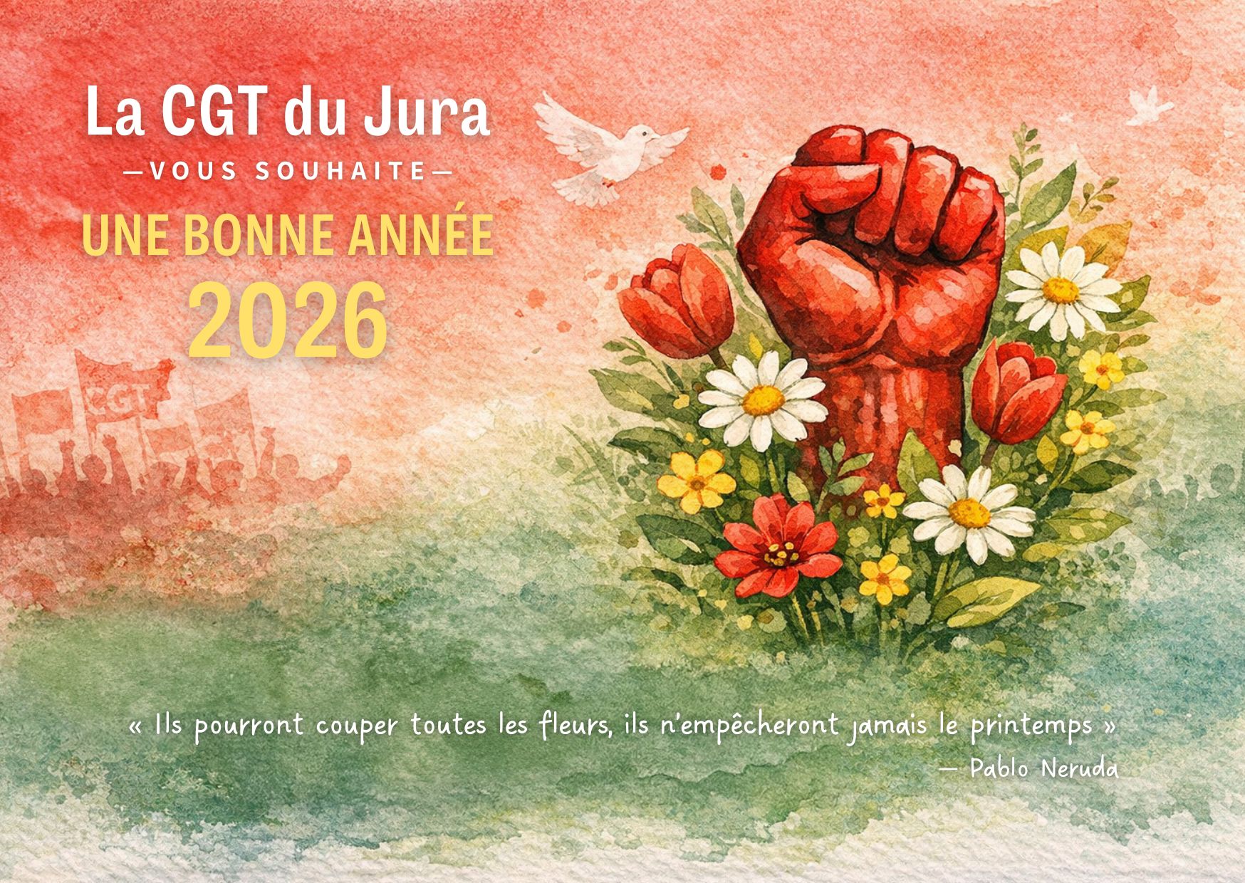 - La CGT Jura vous adresse ses meilleurs vœux pour 2026« Ils pourront couper toutes les fleurs, ils n’empêcheront jamais le printemps » – Pablo Neruda Voir la carte →